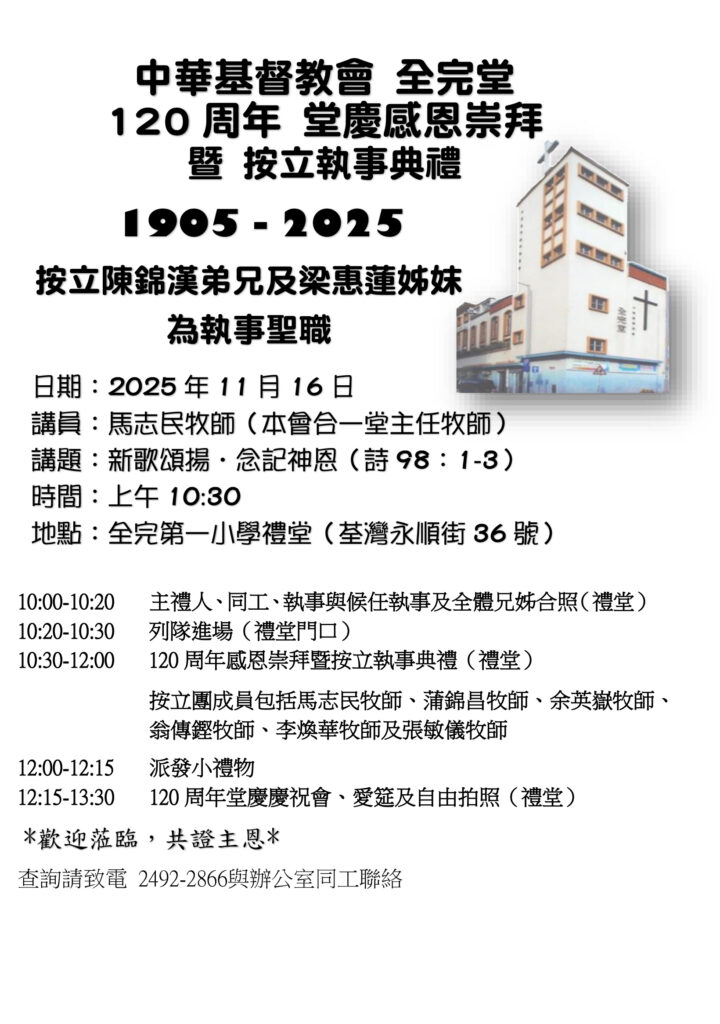 最新消息堂會消息 全完堂舉行120周年堂慶感恩崇拜暨按立執事典禮 2025-09-26 547 分享 FacebookWhatsAppTwitterTelegramEmail打印 本文章於 2025-11-16 星期日 的 23:59 期滿。