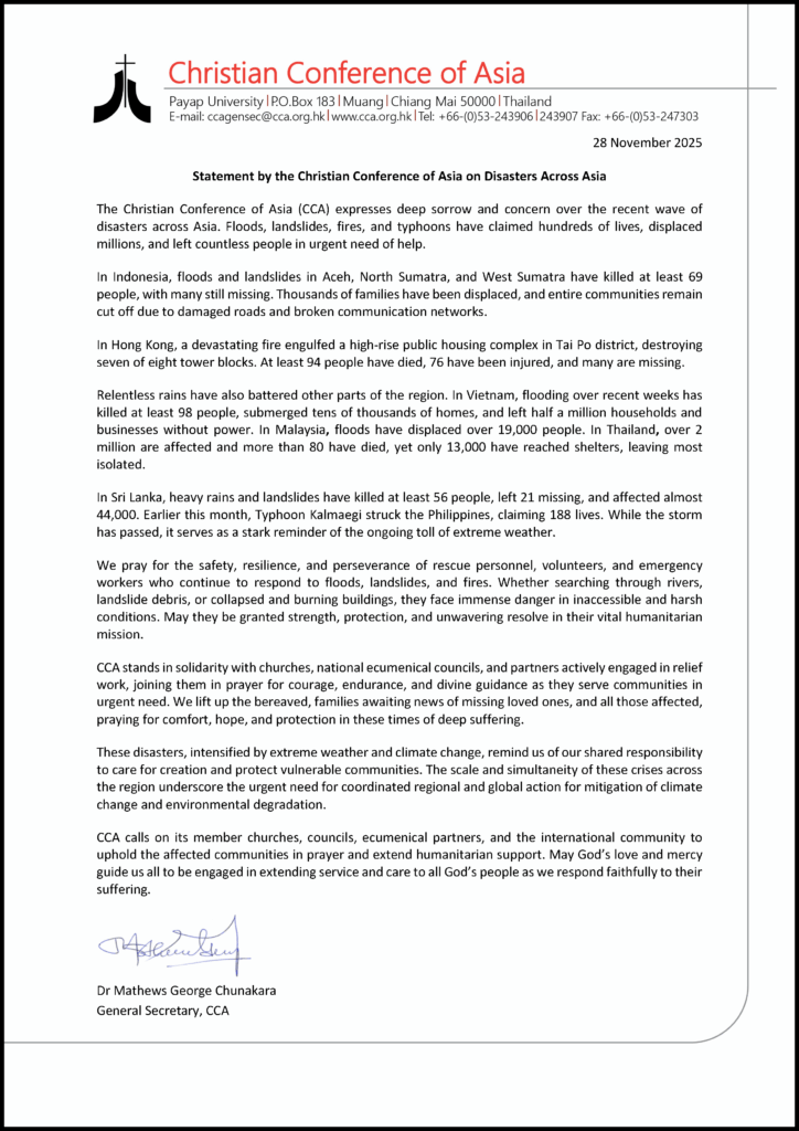 最新消息其他消息消息活動 亞洲基督教議會總幹事來函表達對宏福苑火災災民的慰問 2025-11-29 161 分享 FacebookWhatsAppTwitterTelegramEmail打印 亞洲基督教議會總幹事昨天(11月28日)來函,表達對大埔宏福苑火災喪者深切哀悼,慰問傷者及失去家園者,並為所有受火災影響的人士代禱。