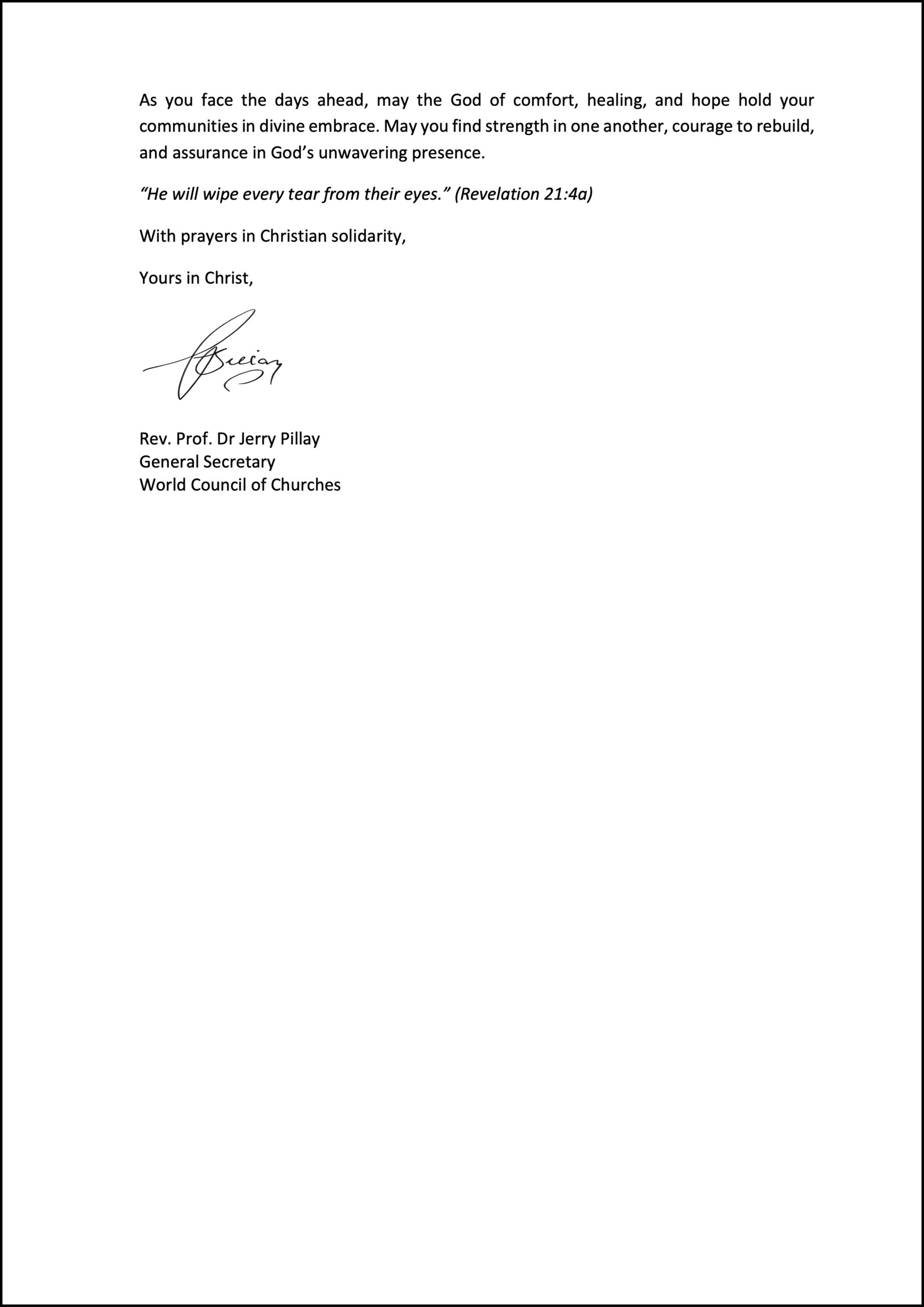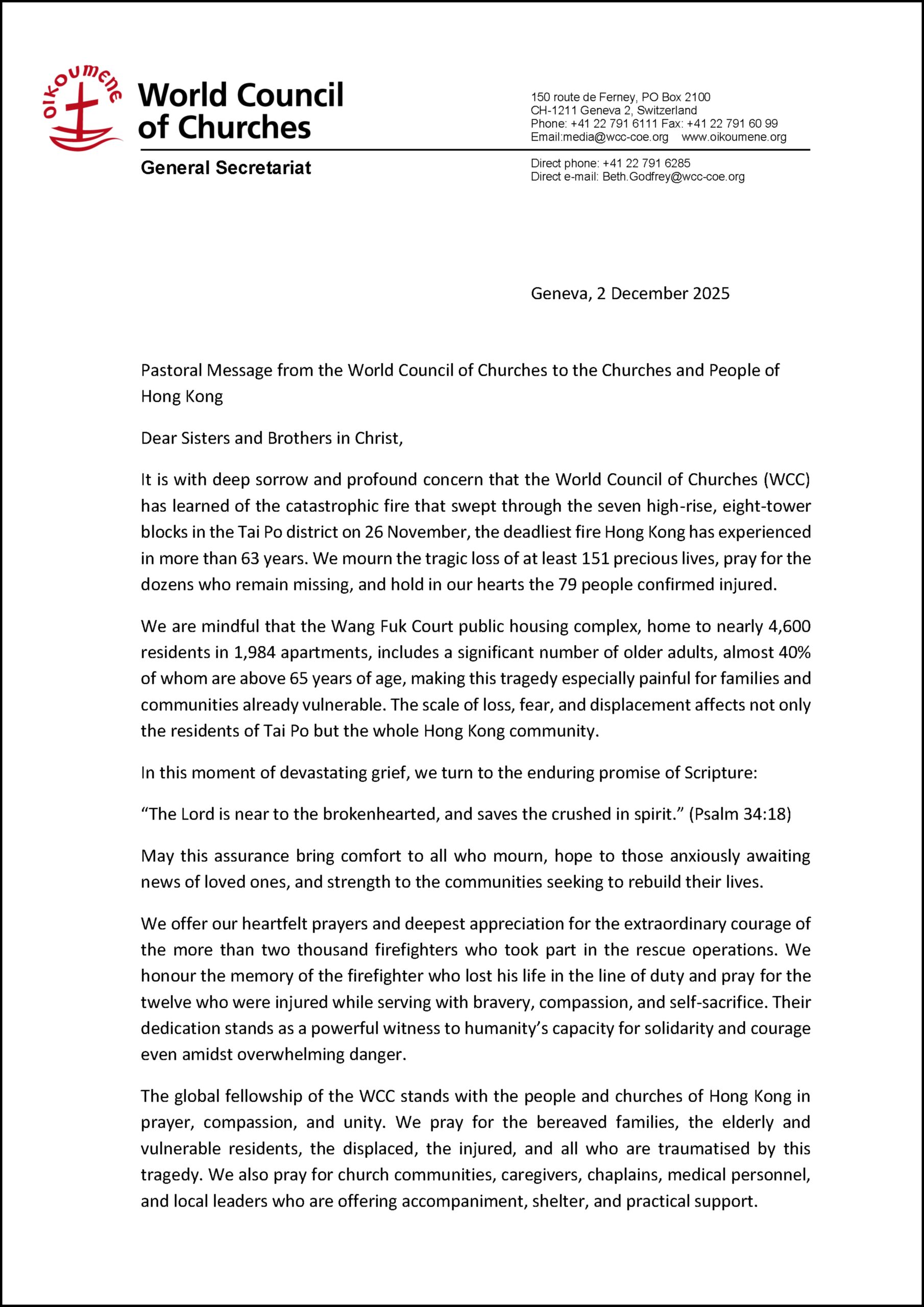 最新消息其他消息 普世教會協會總幹事來函表達對大埔宏福苑火災災民的慰問 2025-12-03 68 分享 FacebookWhatsAppTwitterTelegramEmail打印 普世教會協會總幹事佩雷牧師昨天(12月2日)來函,對大埔宏福苑近日發生的嚴重火災表示深切悲痛與關注,並為遇難者、傷者和受影響的社區獻上祈禱與支持。 本文章於 2025-12-10 星期三 的 06:41 期滿。