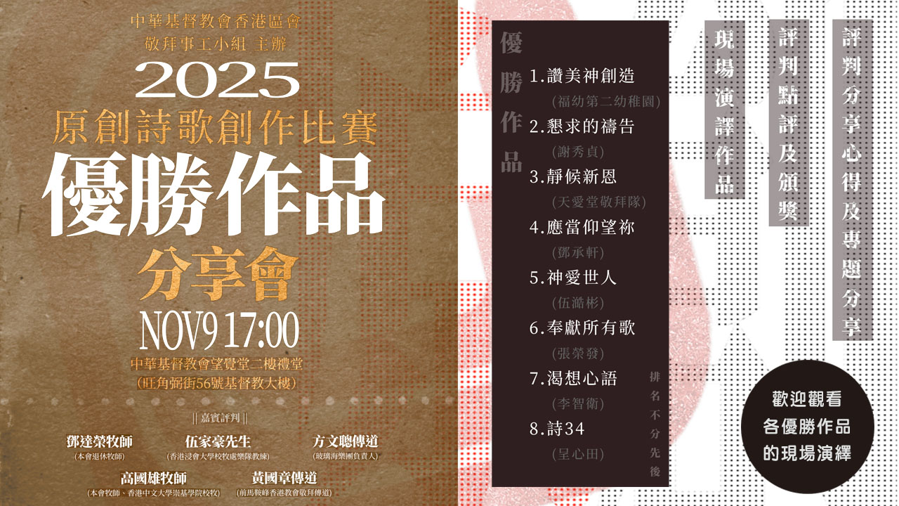 原創詩歌創作比賽優勝作品分享會已於二零二五年十一月九日假望覺堂圖滿舉行,歡迎觀看各參賽單位的精彩演繹。