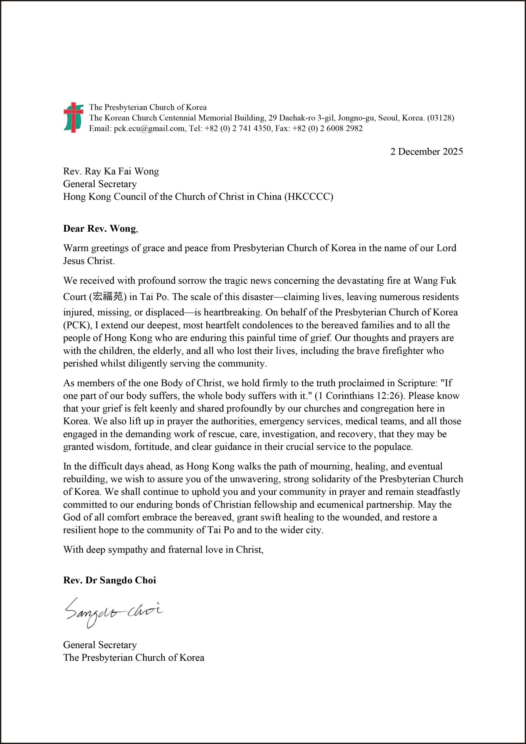 最新消息其他消息 韓國基督長老教會來函表達對大埔宏福苑火災災民的慰問 2025-12-08 24 分享 FacebookWhatsAppTwitterTelegramEmail打印 韓國基督長老教會12月5日來函,對大埔宏福苑近日發生的嚴重火災表示深切悲痛與關注,並為遇難者、傷者和受影響的社區獻上祈禱與支持。